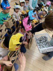 しっかりとお話を聞けたら、お豆に見立てた丸めた新聞紙をみんなの鞄に配ります✋
