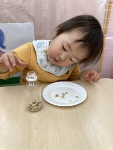 小さなおててで一粒一粒、一生懸命入れていきます🫘