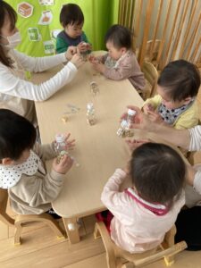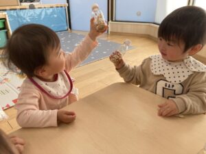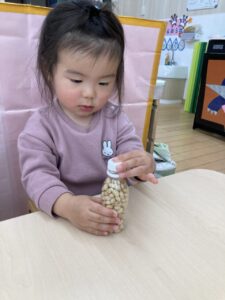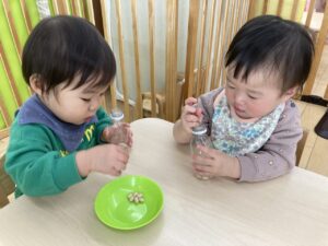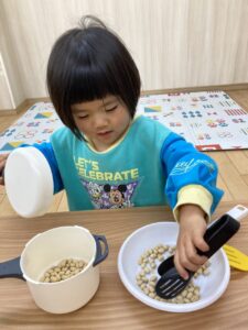その後は大豆を使っておままごとや卵型の玩具に大豆をいれて、マラカス遊びなどを楽しみました😆✨