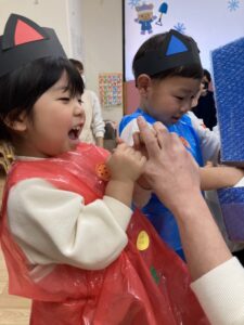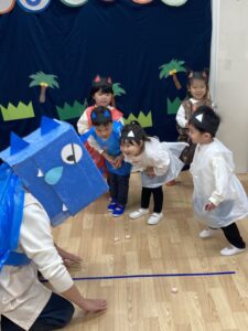 みんなで協力して、ふわふわのボールを投げて見事退治しました!!
