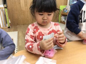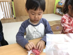 2歳児クラスではいちご狩りごっこをするのでそのために子どもたちと一緒にいちごを作りました🎶