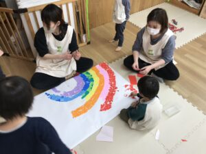 卒園式に飾るフォトスポットの「虹」をちぎり絵をしました!集中して取り組んでくれていた2歳児の子どもたち🎵