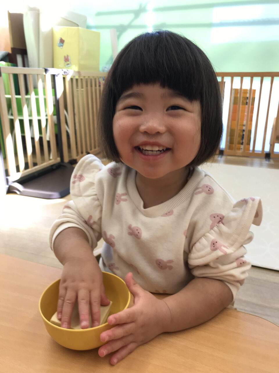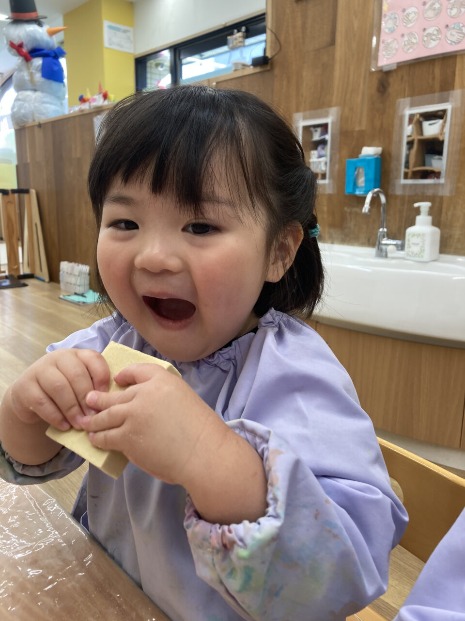 「かたっ!」と言いながら、力を込めて割ろうとしたり、臭いをかいでみたりと興味津々の様子でした✨