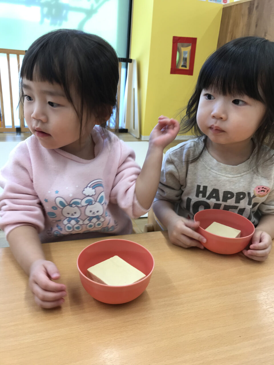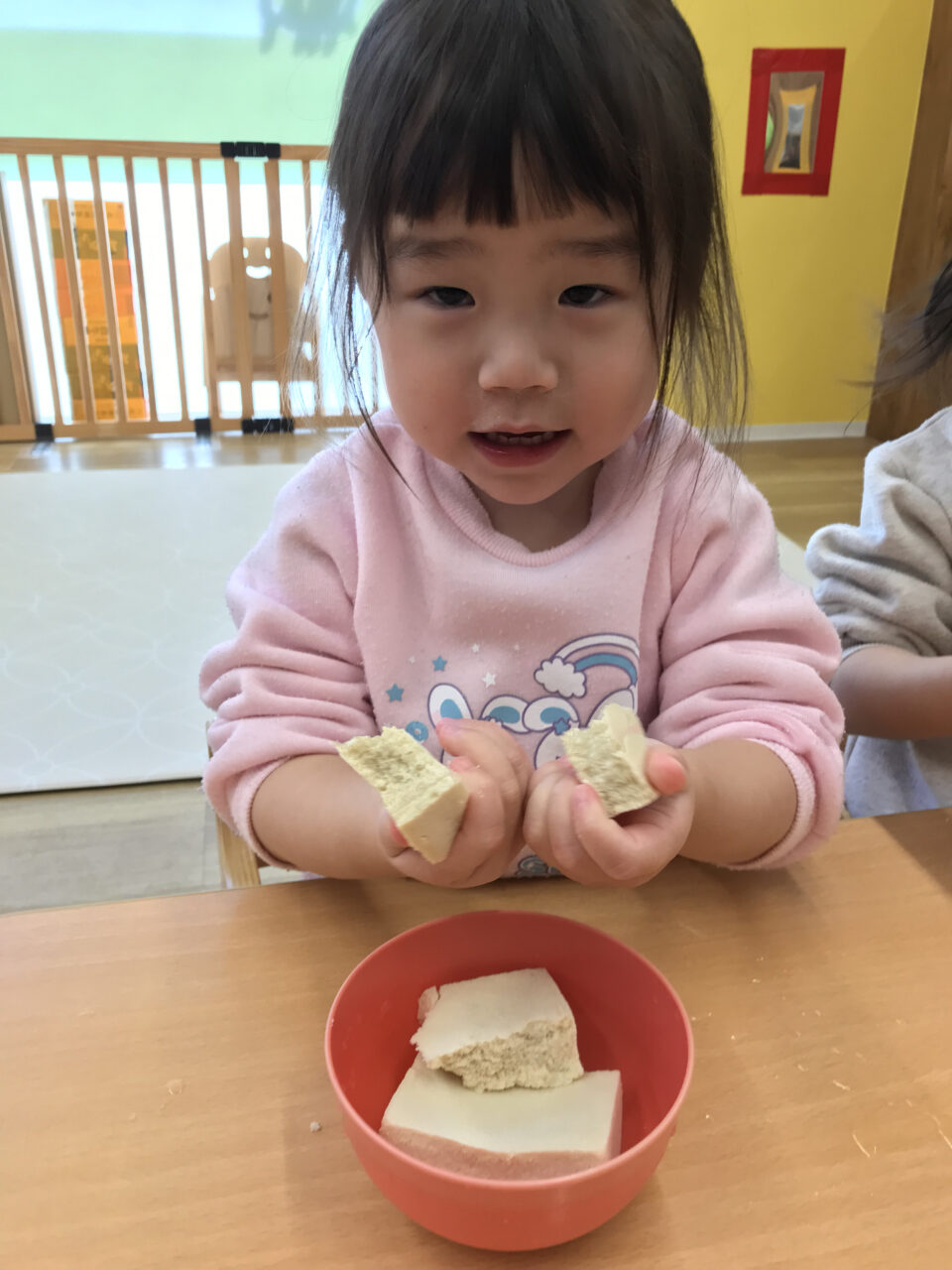 普段は食材として目にする高野豆腐、乾燥した状態のまま触れてみると、その硬さにびっくりする子どもたち😊