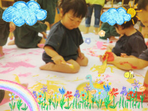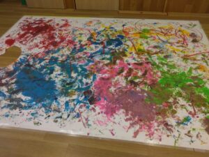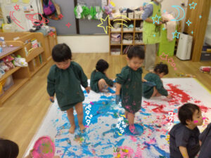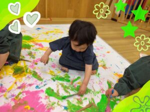 一枚の紙にみんなで絵具まみれにながら