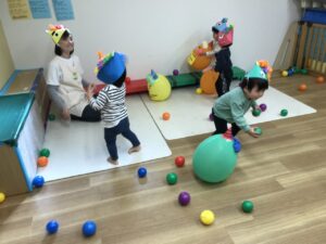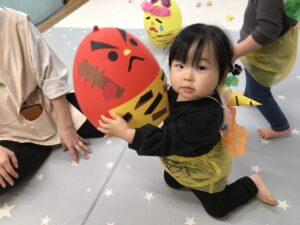 鬼さんはフラフープと風船と段ボールで登場です!!
