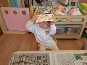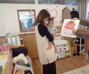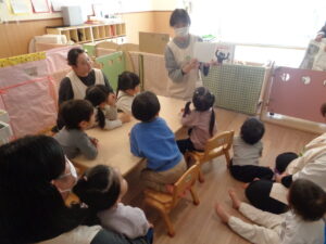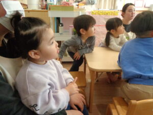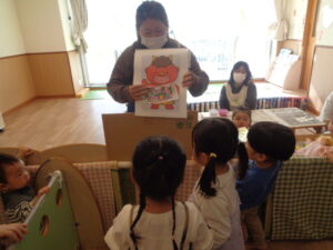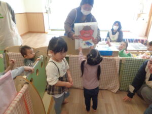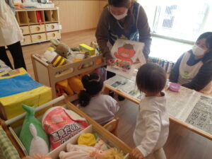 絵本をじっとみつめたり「おにさんだね」とお話をしながら節分の雰囲気を楽しむこどもたち。
