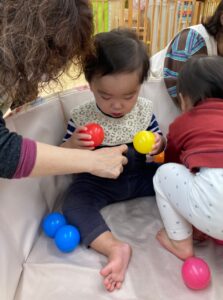 お部屋遊びではボールプールを出してボールを掴んだり投げたり🥎