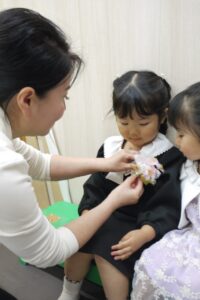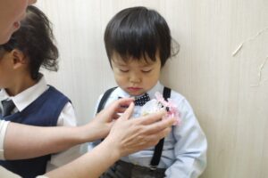コサージュをみんなの胸につけて…
