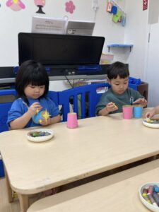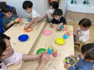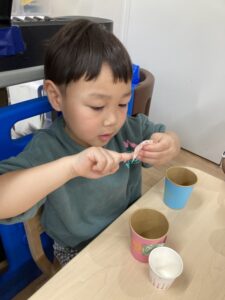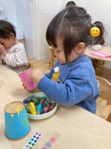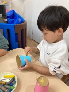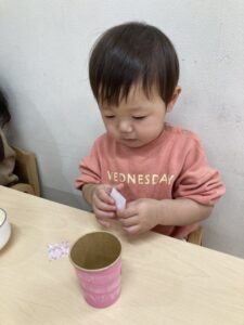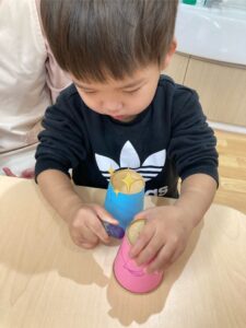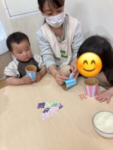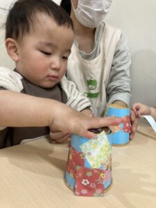 れもん組には両面テープを剥がしてもらい、和柄模様の折り紙を貼ってもらいました✨