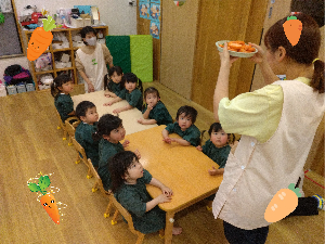 輪切りにしたにんじんを配っていくよ✨