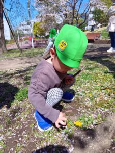 風が気持ちよく、たんぽぽや小さな草花にも興味津々。春の訪れを感じています。
