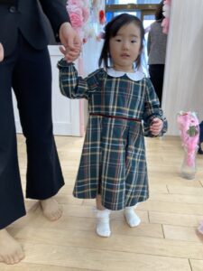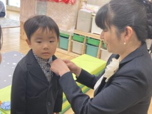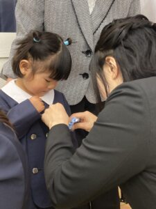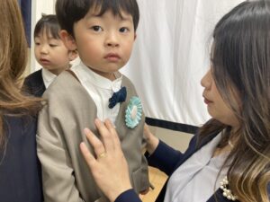 先生に記念のブローチをつけてもらい、入場準備完了です☺️