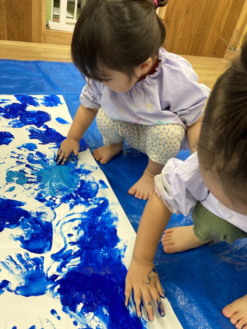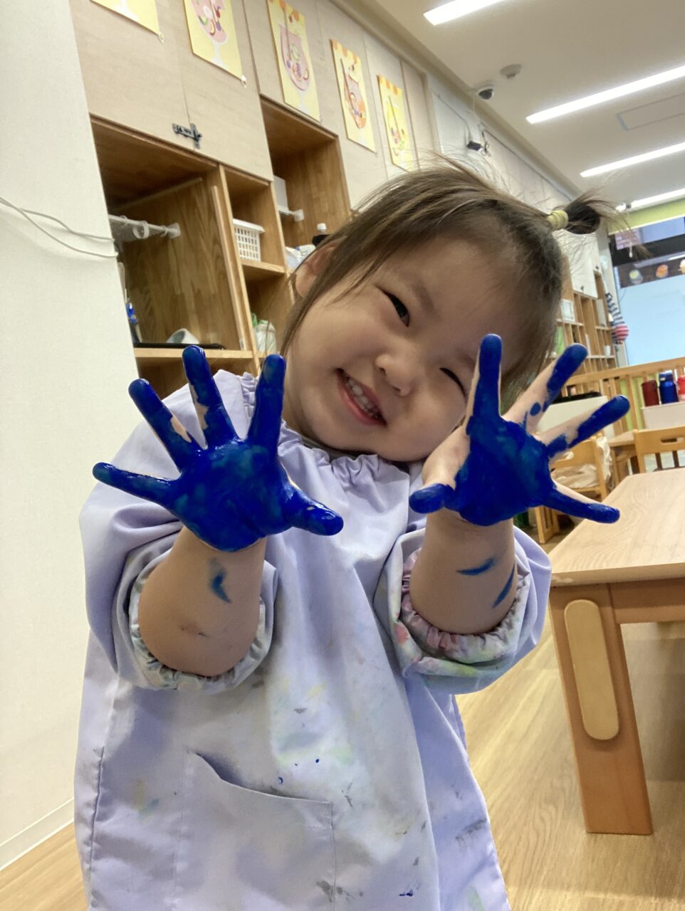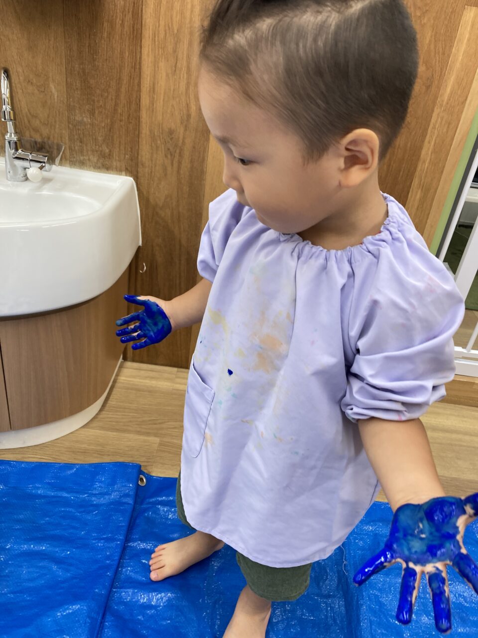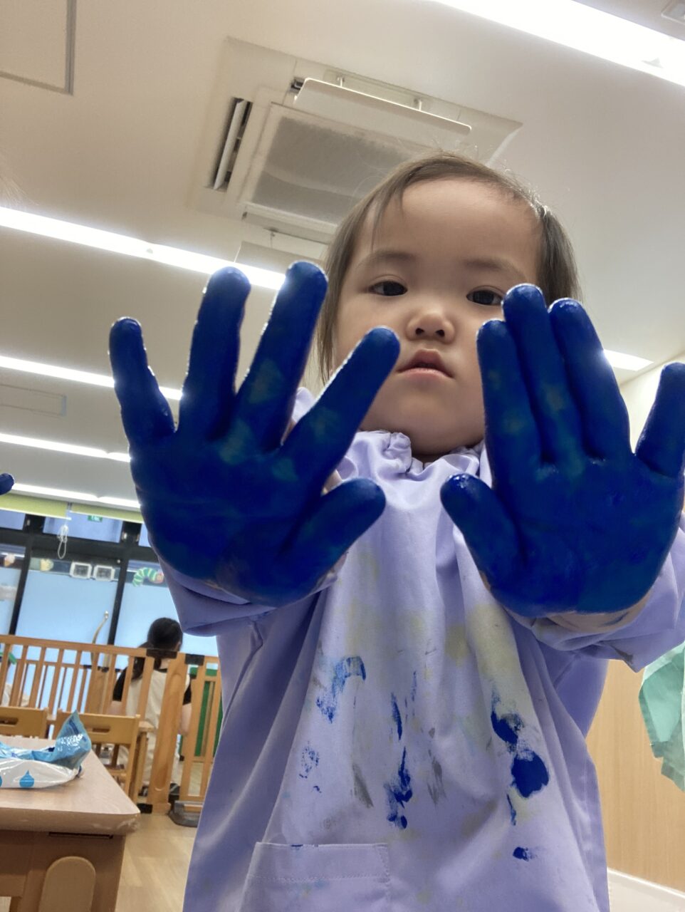 青い絵の具を手にたっぷりつけて大胆にぬる姿は、とても楽しそう✨