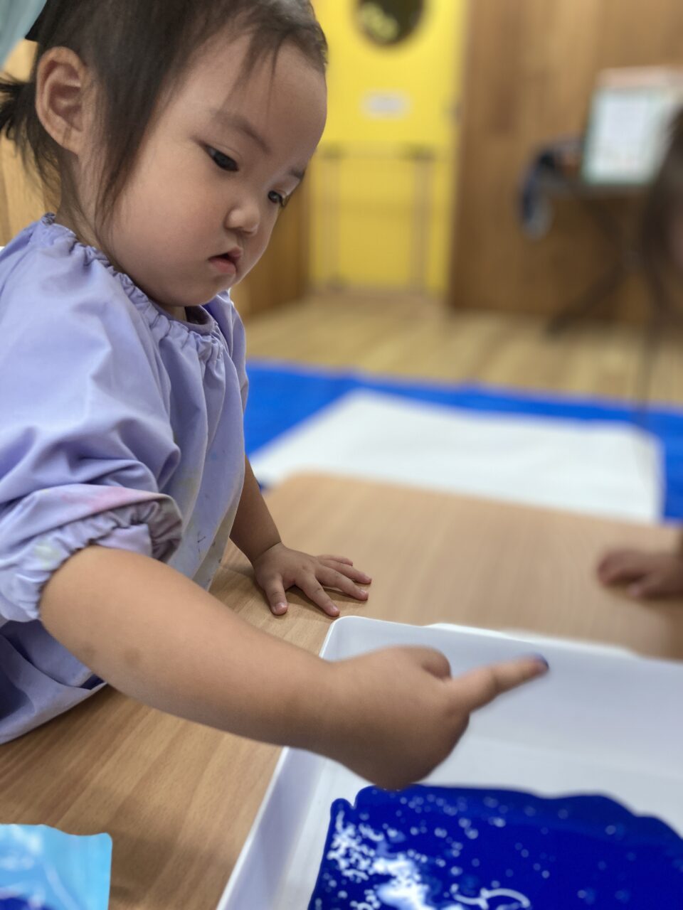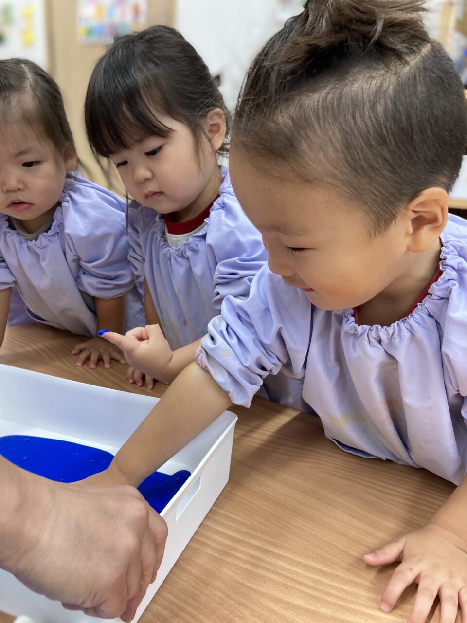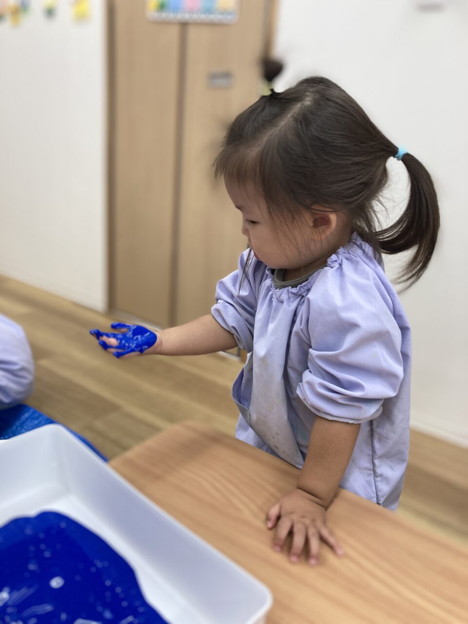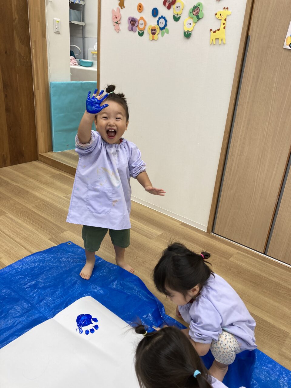 青い絵の具を手にたっぷりつけて大胆にぬる姿は、とても楽しそう✨