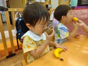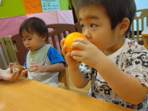 手で触ったり、匂いを嗅いだり、2つの目でしっかり観察したり、どんな味かな、切ると中はどうなっているのかな、と頭を使って考えてみたり、、と五感をフルに使って食べ物に触れてみました!