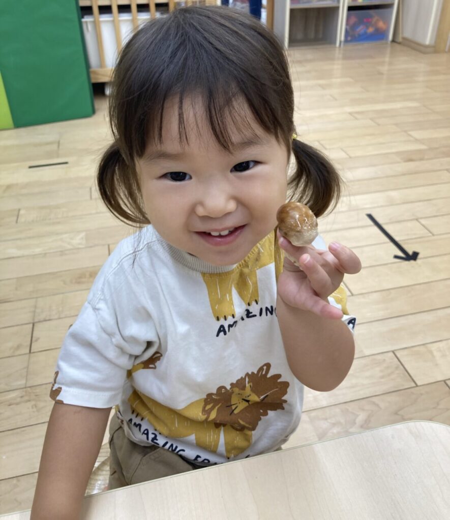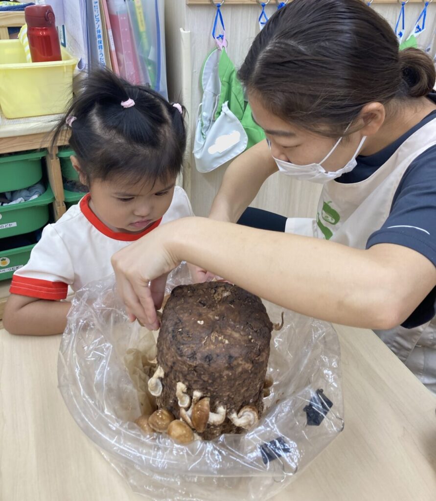 こんにちは!ぴーまん保育園和田町です🫑まだ秋らしさを感じられない暑い日も多いですが、ぴーまん保育園和田町では秋の食育として、秋の味覚『しいたけ』の栽培に取り組みました🍄10日くらいで収穫出来るとのことですが、どうなるでしょうか…⁉