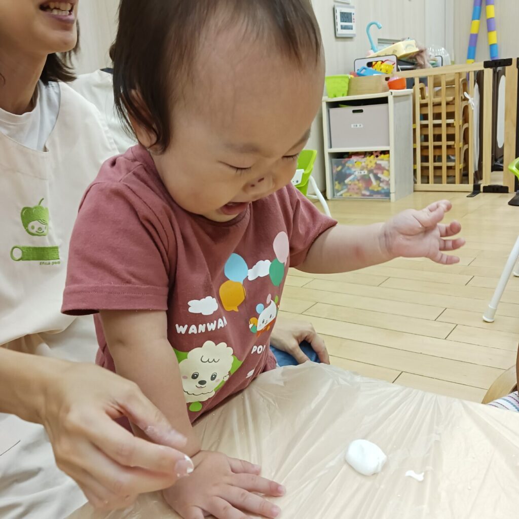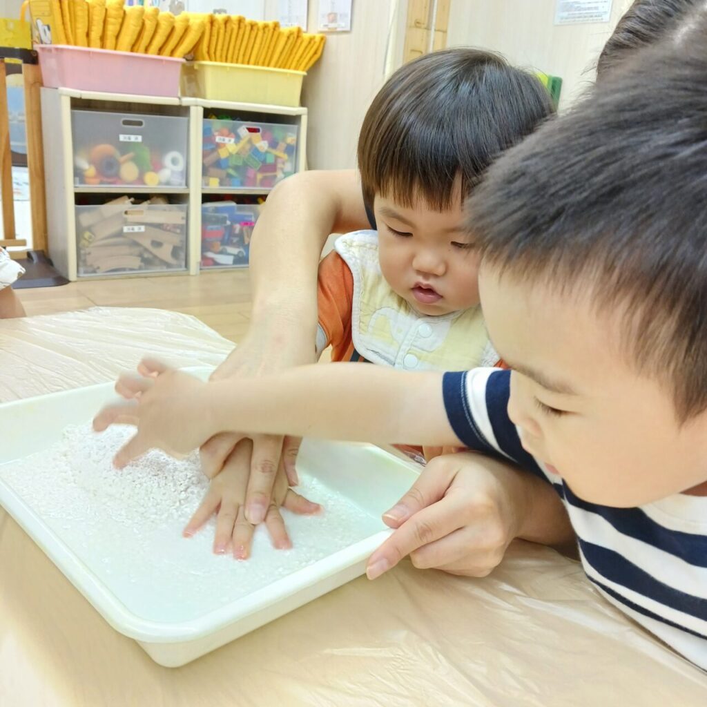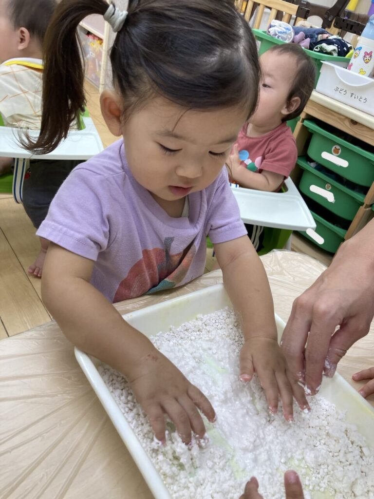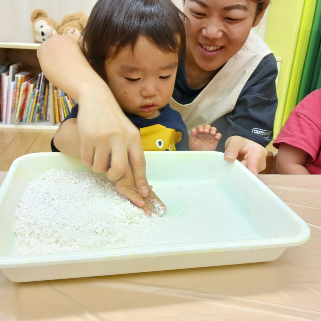 粉はさらさらしているのに、お水を入れたらべたべた。こねていたら粘土の様にまとまってきて不思議だね。
