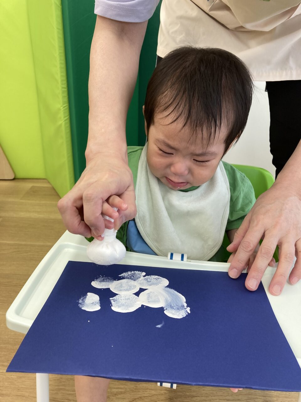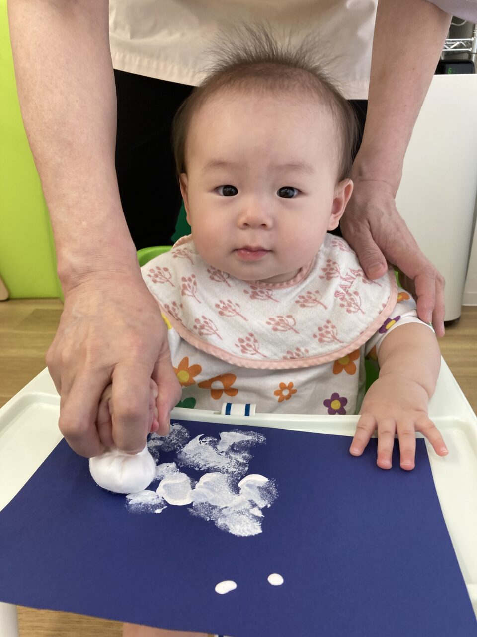 0歳児クラスは白い絵の具で足形をとってうさぎに見立てたり👣タンポンでぽんぽんと色を重ねてお団子を作ったり🎑