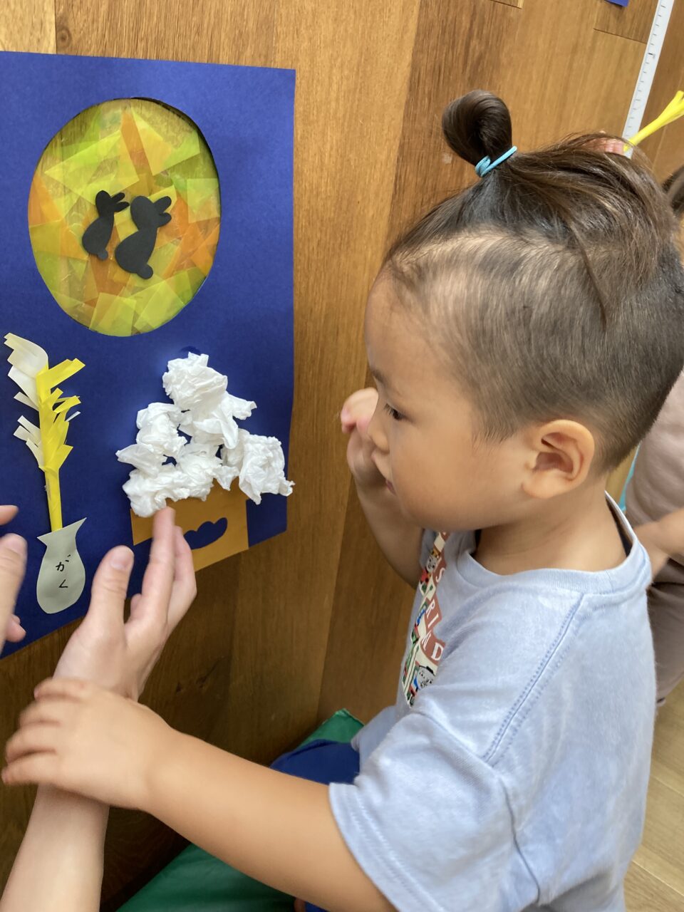 折り紙で作ったすすきも加わり、お月見の風景を感じさせる作品に仕上がりました。