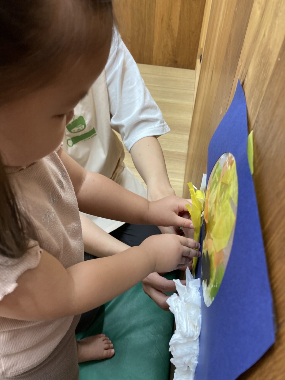 2歳児クラスはティッシュで丸めたお団子や、セロファンを使ってお月さまを表現しました💡