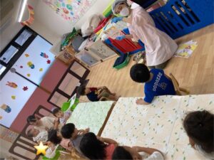 お膝に手をポンと乗せて、お行儀良く聞いているお友達もいれば、