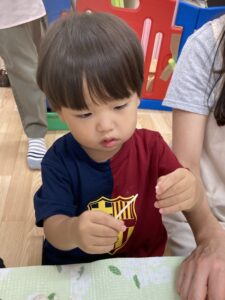 テーブルに腕を乗せて、前のめりで聞いているお友達もいますね(^^)
