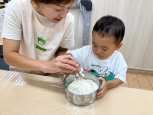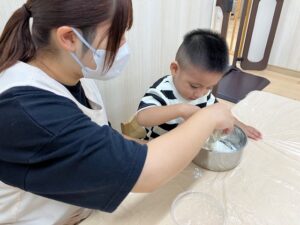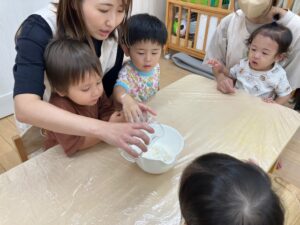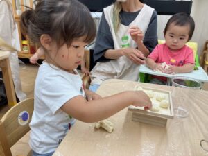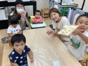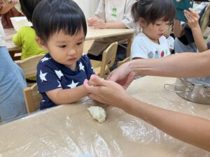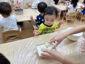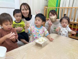 お供えしていたお団子🍡をうっかりうさぎさん🐰が食べてしまったそうです🍡❕これは大変❕みんなでお月見団子を作ることになりました😊