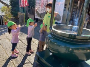 ぴーまん保育園でも朝の会で先生から七五三の謂れやお参りにいくことが伝えられると、子供たちも興味深々に話に耳を傾け、そしていつもより少し背筋が伸び逞しく見えました。