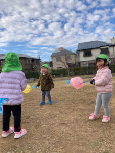 皆でこの前の集会で噛んでもらった獅子舞で遊んでみたり