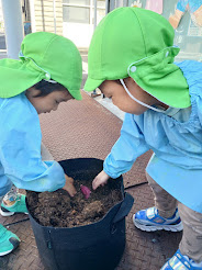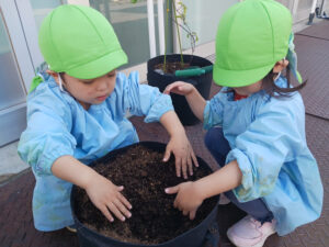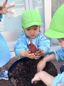 子供たちを一度園の中で待っててもらって先生がその間にさつまいもを土の中に埋めて、さつまいも堀り♬