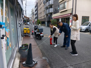 「き(黄色の栓を抜く)、ほ(ホースを持つ)、ぎゅ(ぎゅっとレバーを握る)」の合言葉を教わり、職員一同で実践演習しました。