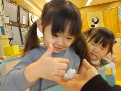 みんなおそるおそる⁈つんつんと触ります🤣 こっちにもあるよー‼️ つめたーい😮❄️ 先生みてみてー😍 上手につかめたよ😆