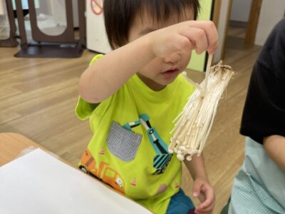 その中でえのきを使って絵具でお絵描きをしてみました。 小さく割いて描いてみたり、たくさん使って大胆に描いている子もいました🎵 しめじも使ってたくさんお絵描きをして大満足 ...