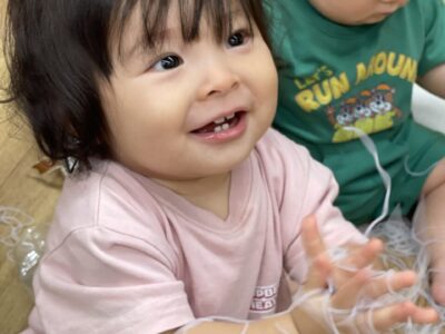 驚きながらも不思議な感触に興味深々でした🎵 とってもニコニコの笑顔ですね💕 床に落ちた春雨も上手に拾って指先が上手にな ...