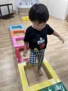 先生手作りのいろんな大きさの箱をタッチしながら進みます!!